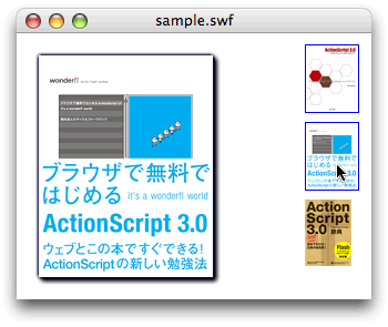 マウスイベントInteractiveObject.rollOver(定数MouseEvent.ROLL_OVER)のリスナー関数(xShow())は、まず引数に受取ったイベントオブジェクト(MouseEvent)のEvent.currentTargetプロパティからロールオーバーしたインスタンスを調べ、その名前の文字列をDisplayObject.nameプロパティで取出します。 つぎに、表示するインスタンスの名前が共通する初めの2文字("my")とロールオーバーしたインスタンス名からとった終わりの4文字(数字 + "_mc")を組合わせて、表示すべきインスタンスを配列アクセスで参照します(show_mc)。 そして、表示するインスタンスをすべて前掲と同じスクリプトで一旦非表示にした後、表示すべきインスタンスのDisplayObject.visibleプロパティをtrueにして改めて表示しています(なお、F-site「ラジオボタンのように複数の中のひとつだけ設定値を変える」参照)。[ムービープレビュー]を確かめると、ロールオーバーしたサムネイルに対応する画像のインスタンスが表示されます(図004)。 図004■サムネイルにロールオーバーすると対応するインスタンスが表示される サムネイルのインスタンスがMovieClipであれば、対応する画像のインスタンスをその変数に設定できます[*8]。そうすればこのサンプルも、インスタンス名を用いなくて済みます。そのように書替えたのが、つぎのスクリプト011です。 スクリプト011■サムネイルにロールオーバーすると変数が参照するインスタンスを表示する