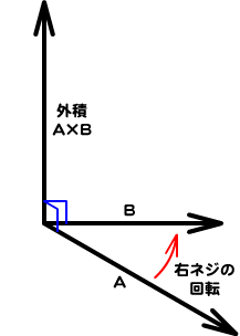 3次元空間におけるふたつのベクトルAとBの外積A×Bは、A×Bで表され、ふたつのベクトルにともに垂直で、ベクトルAからBへの回転で右ネジが進む向きのベクトルとして定められます(図011)。そして、その絶対値(大きさ)はつぎの式で表されます。